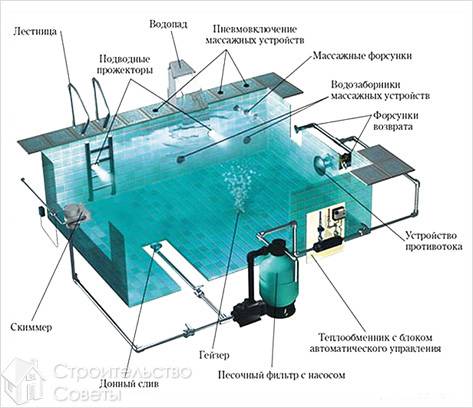 После того как сделана облицовка, устанавливается основное оборудование, подключается вода и можно получать наслаждение от купания в собственном бассейне. Производить монтаж устройств необходимо очень тщательно, используя специальный проект.