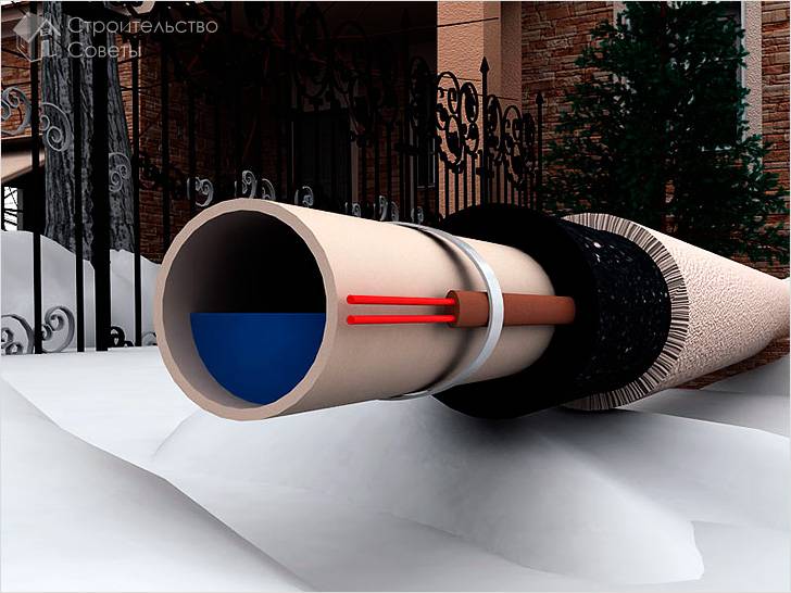 Установка кабеля внутрь трубы возможна в том случае, когда ее диаметр больше 40 мм. В противном случае кабель будет занимать место в трубе, препятствуя протоку воды.