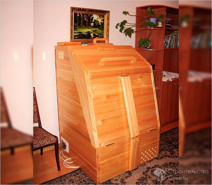 Чтобы подняться на полку необходимо будет изготовить несколько ступенек или лестницу, с использованием резиновых подпятников. Лестницу привяжите к полке бечевкой. Ширина полки должна быть 600 мм. Обогревается такая парилка электроплитой. Ее можно установить на специальную подставку, например, над умывальником. В качестве каменки используйте таз или ведро из металла, которое должно быть заполнено камнями и установлено на плиту.