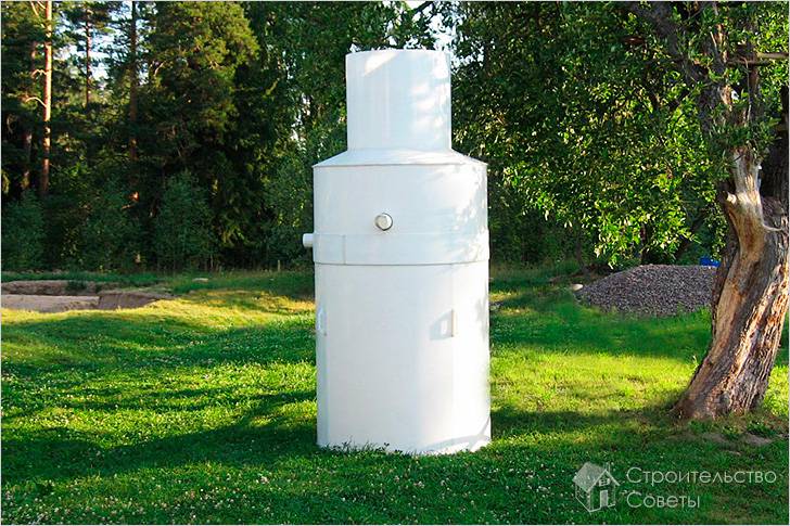 Септик представляет собой моноблочную вертикальную систему, в которой имеется несколько секций. Габариты (высота 3 м, диаметр 1,4 м) позволяют установить канализационную систему вблизи от дома, при этом занимаемая площадь на участке будет минимальной.