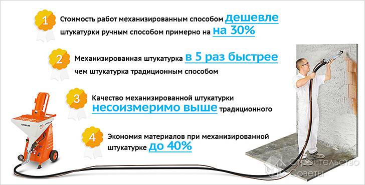 Машинная штукатурка заметно отличается от ручных приемов их отделки, при которых рабочая смесь готовится небольшими порциями и наносится на участки отдельными зонами, высыхающими не одновременно. Результатом такой очередности обработки может стать неравномерность высыхания этих участков и как следствие, возможность появления на них неровностей и трещин. В отличие от ручной обработки машинный способ оштукатуривания позволяет наносить раствор на стены быстро и равномерно.