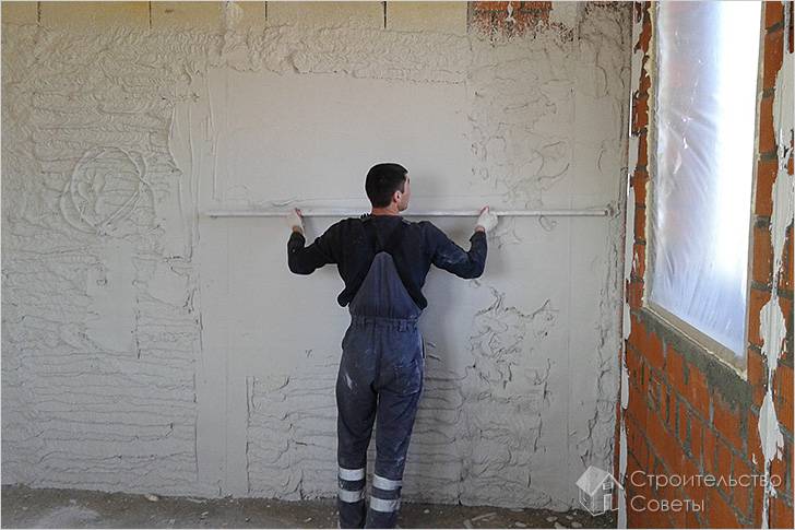 Сразу же после заполнения смесью всех свободных пространств производится предварительное ее выравнивание путем стягивания раствора вдоль ранее установленных маяков (для проведения этой операции вам потребуется правило-клин). Разравнивание и одновременное формирование будущего покрытия должны производиться не позднее чем через 30–40 минут после завершения нанесения штукатурки на отделываемую поверхность.