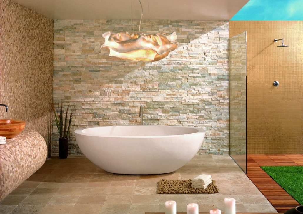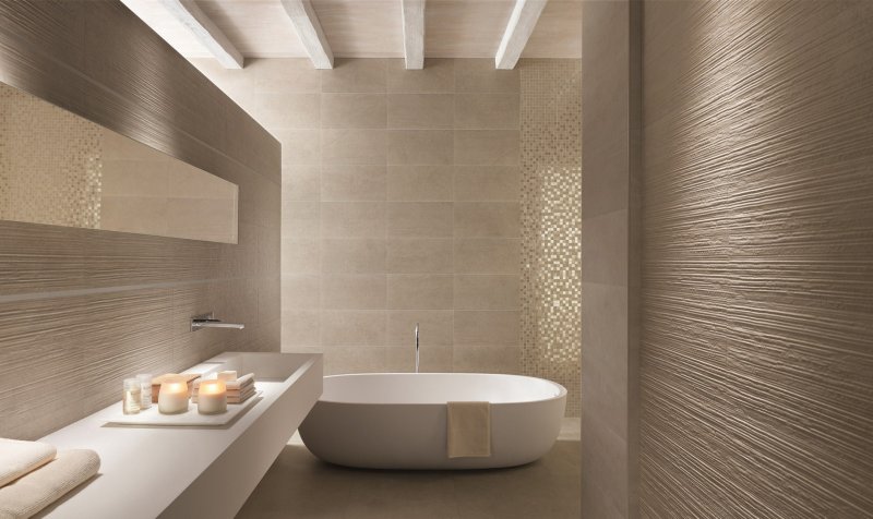 Также оригинального эффекта отделки можно добиться, используя структурную плитку. Несколько крупноформатных плиток с привлекательной поверхностью и искусно выполненное освещение создают потрясающий визуальный эффект. Добиться лучшего результата можно при использовании модной раскладки плитки в ванной.