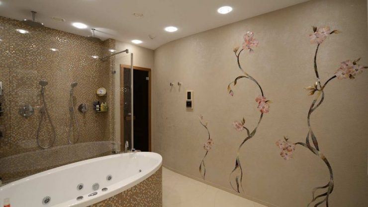 Можно самостоятельно сложить панно из разных плиток или их осколков либо применить готовые решения с рисунками (пейзажи, растения и пр.). Отделка актуальна для стен и полов, а также для стильного интерьерного решения.