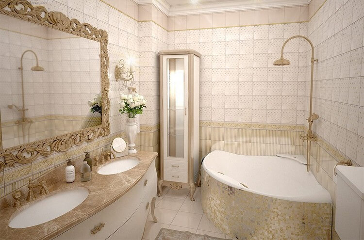 Классический стиль интерьера ванной будет популярным всегда. Для его оформления используют плитку из мрамора. Отделочные материалы для классического интерьера являются качественными и дорогостоящими. Удачным цветовым решением считается выбор спокойных, умиротворяющих оттенков, которые будут хорошо сочетаться с мебелью из дорогих пород дерева.
