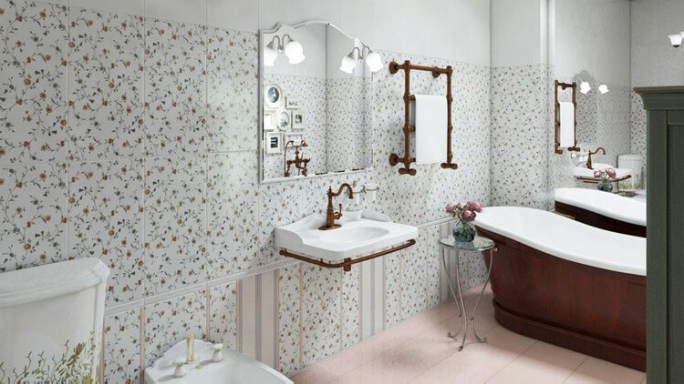 Для интерьера ванной в стиле прованс используют сдержанные пастельные цвета керамической плитки. Такая гамма настроит хозяев ванной комнаты на романтичный лад. Лучше всего подойдут небесно-голубой, лавандовый и нежно-розовый. Для отделки стен выбирают плитку с мелким растительным орнаментом.