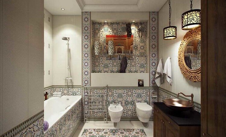 - Более того, оригинальный цвет модной плитки для ванной комнаты на одной стене или фрагменте пола может не только стать важнейшим украшением ванной комнаты, но и оптически скорректировать ее пропорции. Мозаика, плитка с восточными и марокканскими орнаментами являются акцентами на нейтральном фоне.