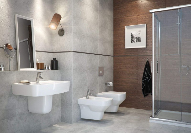 Облицовка плиткой с цементным эффектом создает ощущение простора, выглядит свежо, аккуратно. Одинаково хорошо подходит для стен и пола ванной комнаты.