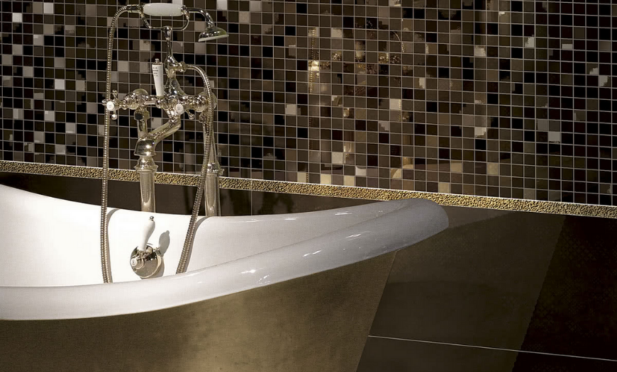 - Мозаика используется для того, чтобы сделать определенный акцент при отделке ванной комнаты. Мозаика требует сложного монтажа, поэтому стоимость работ при установке достаточно высокая.