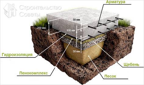 После укладки геотекстиля следует произвести подсыпку из щебня с песком, а затем хорошо увлажнить её и тщательно утрамбовывать. Поверх получившейся подушки укладывается толстая полиэтиленовая плёнка, выполняющая в данном случае роль гидроизоляции. Затем подготавливается деревянная опалубка, которая в целях предупреждения «убегания» бетонного молока также закрывается полиэтиленом.