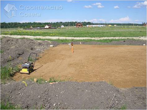 Изготовление плитного фундамента своими руками начинаем с подготовки грунтовой основы для него, которая заключается в выравнивании и разметке площадки, выемке грунта на глубину до 35 см. Получившуюся выемку застилаем геотекстилем, который хорошо удерживает песчано-щебеночную засыпку, но в то же время пропускает воду.