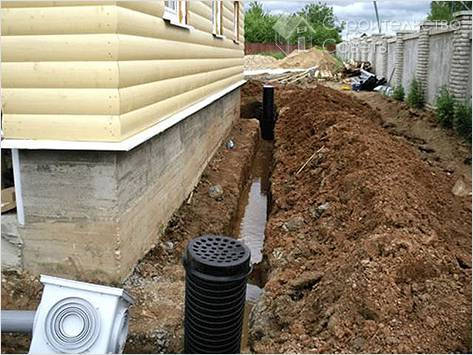 - Пристенный дренаж делают по периметру фундамента (желательно ниже его подошвы) с помощью специальных дренажных труб, которые укладывают с уклоном к магистральной трубе, которая будет отводить влагу в общую систему.
