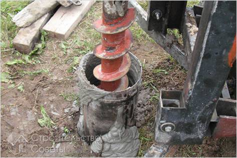 На первом этапе бурят скважины с помощью ручного бура или специальной машины. Дно каждой скважины просыпают щебнем и заливают бетонным раствором. В подготовленную яму до полного застывания бетона опускают асбестоцементную трубу. Как правило, подбирают новые трубы или б/у изделия в хорошем состоянии диаметром не менее 200 мм. По длине трубу выбирают таким образом, чтобы она выступала над поверхностью грунта на 300-350 мм.