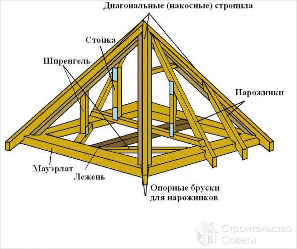 Выбирая геометрию карнизных свесов, следует учитывать, что расстояние от конца свеса до наружной стены должно быть 50 или более сантиметров. Просуммировав рассчитанные площади скатов, мы получаем площадь всей кровли, которая далее используется для расчета потребности в материалах. Также необходимо произвести расчет требуемой длины диагональных стропил (находящихся «в ребрах пирамиды»).