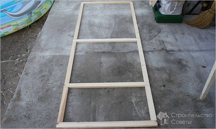Вначале замеряем дверной проем. Допустим, что в нашем случае он 2×0,8 м. Следовательно, к каждой заготовке нужно прибавить ширину двух брусков, чтобы внутренняя часть рамки получилась одинаковой с дверным проемом. Получаем два вертикальных бруска длиной 2,08 м и четыре по 0,88 м.