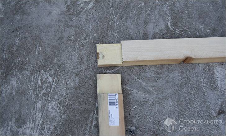 С двух сторон каждого элемента нужно сделать паз. Для этого от края отступаем 40 мм и отмечаем – в этом месте брусок пропиливается до половины. Потом стамеской удаляется отпиленная часть. То же самое нужно сделать в тех местах, где будут установлены поперечины – в местах их посадки тоже делаются выемки 40×10 мм. В том случае если будет оставлен лаз для животного, нижняя поперечина будет закреплена несколько ниже. Закончив с этой процедурой, можно приступать к сборке каркаса.
