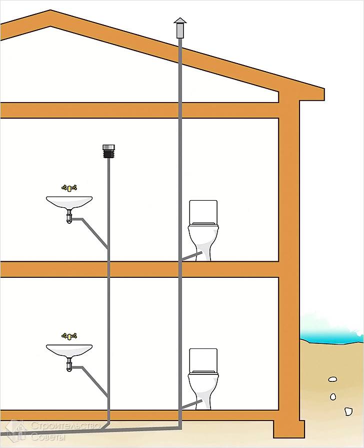 Если вы применяете трубы с нужным диаметром и все правильно подсоединили, это еще не гарантия, что система будет работать как следует. Чтобы обеспечить хороший проход стоков необходимо установить фановую трубу.