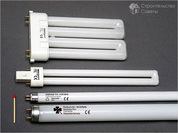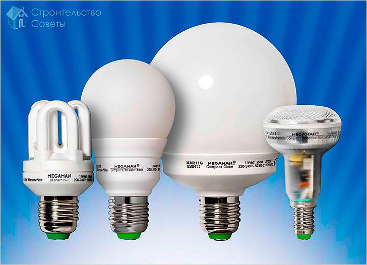 - Энергосберегающие лампы. Это ещё одна разновидность осветительных элементов, применяемая в быту. Так принято называть значительно уменьшенные в размере люминесцентные лампы. Среди преимуществ этого типа ламп можно упомянуть значительно меньшее энергопотребление и температура, но больший срок эксплуатации. На рынке существует огромное количество вариантов таких ламп, которые отличаются как по форме колбы, так и по типу применяемого цоколя.