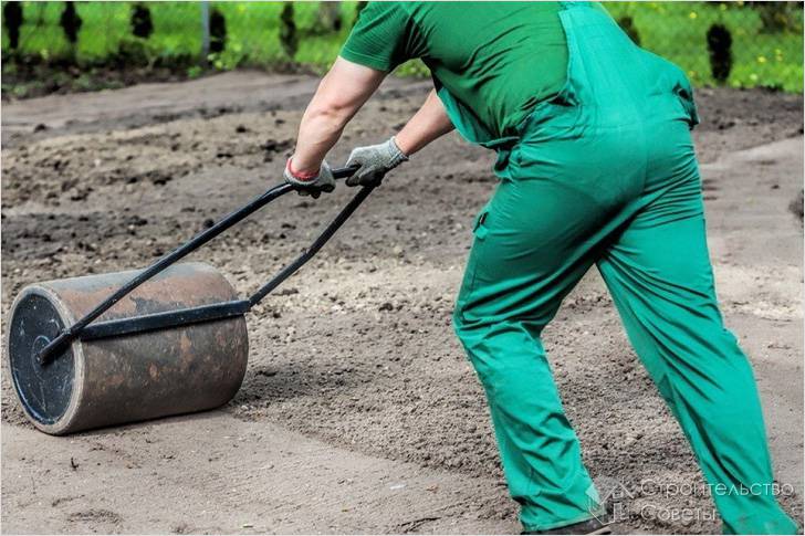 Для создания идеального газона землю нужно утрамбовать. Эту операцию выполняют с помощью катка. Большую бочку наполняют щебнем или песком и катают по участку – самый простой способ ручной утрамбовки. Можно приобрести специальные катки или воспользоваться техникой для утрамбовки.
