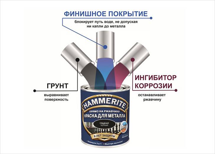 Краска по ржавчине Hammerite лишена означенных выше недостатков. Благодаря своей уникальной химической формуле, краска, помимо достаточно длительного времени сохранения характеристик, может наноситься прямо на ржавчину, что в значительной степени упрощает работу и экономит время, затрачиваемое на окрашивание. Дело в том, что краска состоит из трёх взаимодополняющих компонентов (см. Картинку).